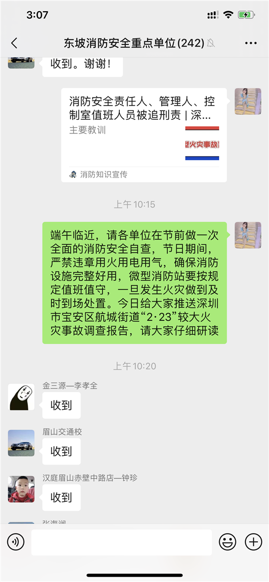 四川新闻网眉山6月23日讯 为进一步做好端午期间消防宣传工作,扩大消防宣传覆盖面,切实提高单位、群众消防安全意识及自防自救能力。东坡区消防救援大队通过微信群向单位发送端午期间消防安全提示助力节日期间消防安全。针对节日期间的人群数量大,娱乐场所、商场市场等公众聚集场所人流量增多的特点,大队充分借助“消费群体人手一部手机”的理念,加大对单位的消防安全提示,提醒单位在营业、生产、工作期间要保障疏散通道、安全出口畅通,严禁堵塞或锁闭,确保消防设施完整好用,微型消防站要按规定值班值守,一旦发生火灾做到及时到场处置。
