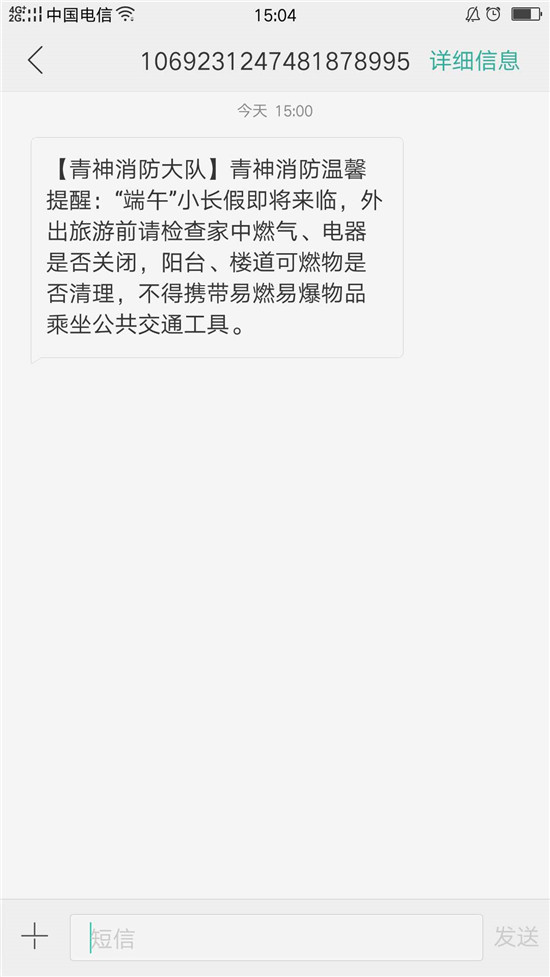 “青神消防温馨提醒:“端午”小长假即将来临,外出旅游前请检查家中燃气、电器是否关闭,阳台、楼道可燃物是否清理,不得携带易燃易爆物品乘坐公共交通工具;在进入公共场所时请留意安全出口位置,记住逃生方向和路线。一旦遇到火情,不要慌乱,要按照工作人员的指示有序逃生。”大队充分借助手机网络覆盖面积广、宣传高效快捷的优势,通过手机短信群发平台,将通俗易懂、贴近生活和实际的防火灭火等消防安全知识发送至辖区手机用户,将消防安全宣传工作延伸到社会每一个角落。