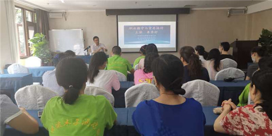 辜多好是四川省旅游协会副主席,原眉山市旅游局副局长,红珠山宾馆原总经理。他应邀到场并以“坚守职业操守、做好重要接待”为主题,通俗易懂地讲述了酒店管理。在回顾旅游酒店业的起源和国际国内发展趋势后,他选用各类案例,引导员工在热爱本职工作的同时,首先要抵制金钱和物质的诱惑,坚守职业道德底线。其次要及时妥善处理突发事件。针对七月重要接待,他分别从组织机构、硬件设施维修、定岗定位定人、三餐菜品、信访与安全等方面提出了明确的实践要求。