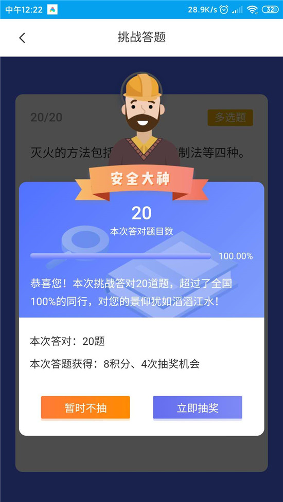 二是开展安全生产知识竞赛网络答题活动。大队积极按照文件要求,每日组织大队全体职工及家属积极参加全国“安全生产月”网络知识竞赛活动。通过在线广泛学习安全生产知识,营造了知晓安全、重视安全、维护安全的浓厚氛围,使安全知识实实在在运用到日常的工作中,防范于未然,减少甚至避免安全事故的发生。