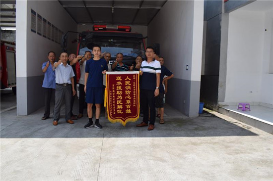 四川新闻网眉山6月30日讯 6月30日,东坡区万胜镇万新村村民委员会将一面印有“人民消防心系百姓、送水援助为民解忧”的锦旗送到东坡消防万胜专职消防队,对消防队员们及时服务群众,为村上积极义务送水的行为表示感谢。