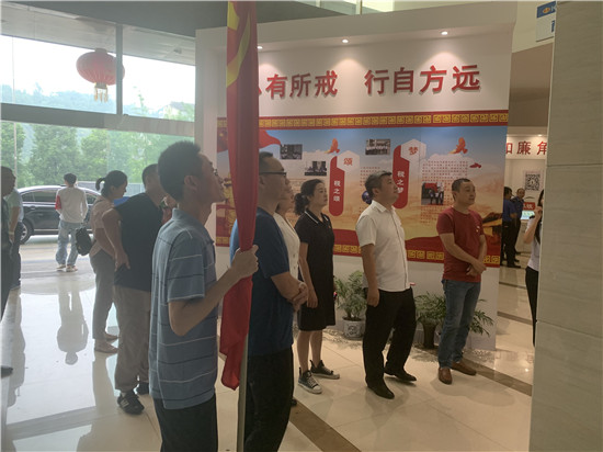 全体党员在县廉政教育基地进行了庄重严肃的重温入党誓词仪式;局党组书记、局长以“有担当、知敬畏,做廉洁模范”为题,现场为全体党员上了一堂生动的廉政党课;并向全体党员发放了《清风扬眉、廉洁齐家—致全体党员的一封信》;随后,全体党员参观了县税务局廉政教育基地。