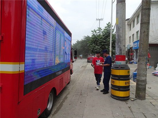 宣教人员利用车载的多媒体播放功能播放各类防汛减灾视频,向群众讲解防火、防雷、火场逃生和扑灭初期火灾方法等知识,并现场发放防火、防雷宣传资料,用简单易懂的语言为过往群众现场讲解有关的防汛减灾知识。针对当前雷暴雨季节用火用电应注意事项等相关问题进行了现场答疑,教大家如何正确进行火灾报警、火场逃生自救,还讲解了对于电器初期火灾的处置以及灭火器的使用方法。