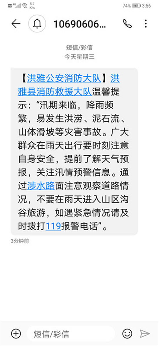 “温馨提示:汛期来临,降雨频繁,易发生洪涝、泥石流、山体滑坡等灾害事故。广大群众在雨天出行要时刻注意自身安全,提前了解天气预报,关注汛情预警信息。通过涉水路面注意观察道路情况,不要在雨天进入山区沟谷旅游,如遇紧急情况请及时拨打119报警电话”。 此次短信内容简易清晰、通俗易懂,具有很强的实用意义和教育意义,切实提升社会各界和广大群众的防汛安全意识。