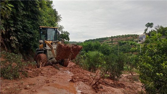 8月19日,在白果乡虎渡社区16组的村组道路上,一台小型推土机正对垮塌下来的泥石进行清理。操作这台机器的是该社区的党员、后备干部陈侨辉。