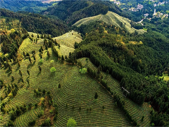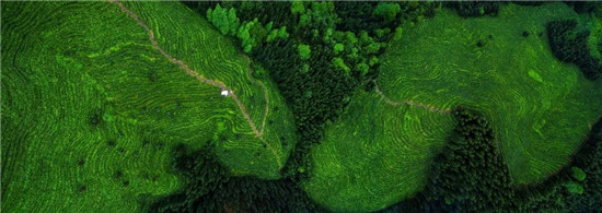 在这些从高处拍摄的照片中,最有意思的当属茶山美景,放眼望去,那片绿能绿到你心坎里。