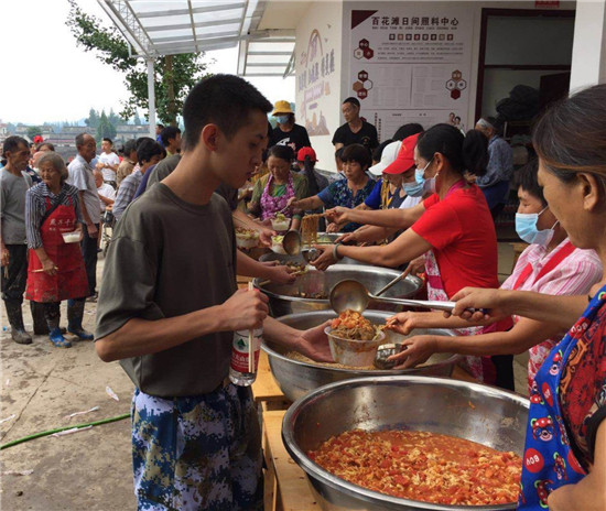 “第一天只是为受灾的村民准备饭菜,从8月19日开始,志愿者们为联丰村5组的受灾村民开展灾后恢复工作,我们就一并准备他们的饭菜。”54岁的李永容是联丰村老年协会的会长,她的儿媳是联丰村一名村干部。8月18日一大早,她给半夜就外出巡查的儿媳打电话了解情况后,立即联系老年协会的其他成员,挨个询问受灾情况,号召受灾不严重的成员到村日间照料中心为受灾村民服务。就这样,9名成员很快带着蒸笼、锅碗瓢盆等做饭工具和大米、挂面、蔬菜赶到了百花滩日间照料中心。说到这次救灾,李永容的想法很简单,要尽自己所能为救灾工作出一份力。