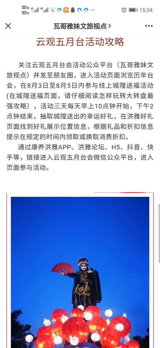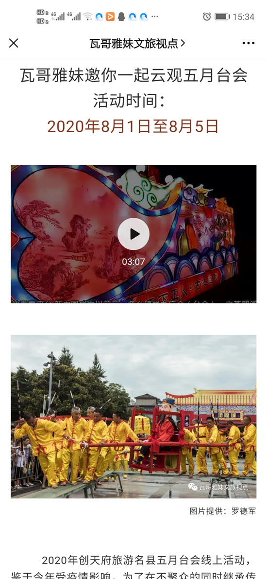 洪雅非遗,重在展现民俗文化魅力。今年,受疫情影响,洪雅县文广旅局精心选取素材,将近年“五月台会”活动情景制成视频,创新推出“云观非遗五月台会”活动,在抖音、快手、微信视频号及康养洪雅APP上进行推广展示,深受线上线下游客喜爱。