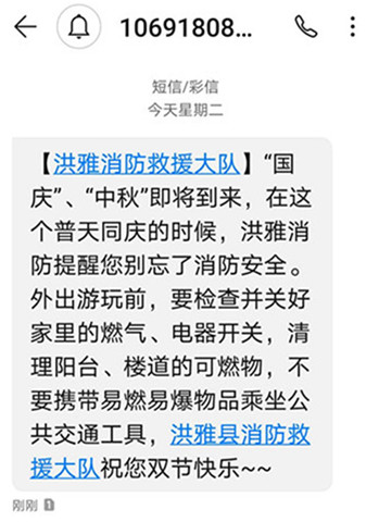 “国庆、中秋即将到来,在这个普天同庆的时候,洪雅消防提醒您别忘了消防安全。外出游玩前,要检查并关好家里的燃气、电器开关,清理阳台、楼道的可燃物,不要携带易燃易爆物品乘坐公共交通工具,洪雅县消防救援大队祝您双节快乐” 短信内容言简意赅,具有很强的实用和教育意义,起到了良好的社会宣传效果,进一步扩大了消防安全宣传面和覆盖面。
