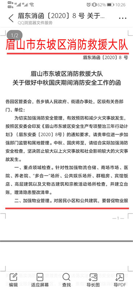 《函》结合各行业系统火灾特点,根据《中华人民共和国消防法》、《四川省消防条例》和《国务院消防安全责任制实施办法》,提示各单位认真履行消防安全法定职责,加强对所服务的居住、商业、工业等区域的消防安全管理。同时,还提醒各行业部门切实履行业部门监管职责,做好宣传教育培训,全力确保“双节”全区火灾形势稳定。(东坡区消防救援大队供稿)
