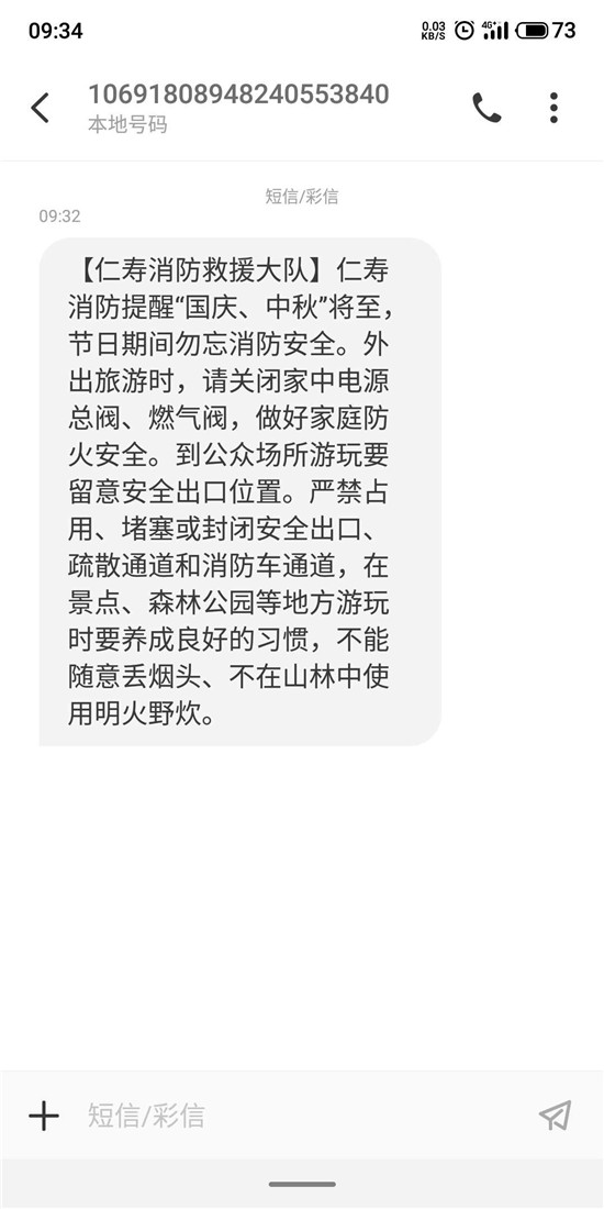 四川新闻网消息(方龙全 文/图)“国庆、中秋”双节将至为促进辖区消防宣传工作深入开展,不断扩大消防宣传覆盖面,切实提高辖区民众的消防安全意识,节前,仁寿消防救援大队利用短信平台,向辖区重点单位及市民免费发送温馨短信提示,为节日火灾防控工作营造浓厚的宣传氛围,确保辖区火灾形势的安全稳定。