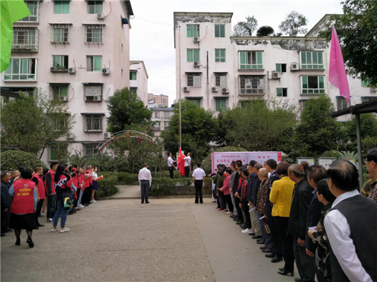 白衣服、白手套,捧起这颗红色的“中国心”,9点整,嘹亮的国歌在小区上空奏响,升旗手托着五星红旗昂首阔步走向旗台,大家的目光随着冉冉升起的国旗徐徐上扬。