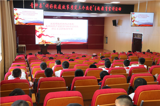 青神县中医院护理部副主任、康复科护士长、援助湖北医疗队队员黄利惠分享了亲身经历《我在武汉的日子》。面对不断攀升的数字和井喷式增长的患者,她临危受命,逆行千里,驰援武汉。“生命所系,性命相托”,“疫情不退,我们不退”。在短暂而漫长的38天,收获温暖和爱,感受中国力量、中国精神、中国效率、中国强大。她亲切勉励孩子们努力学习,将来投身祖国的医学事业。关工委“五老”宣讲团李彻新讲了《从疫情防控的伟大胜利看中国共产党的领导和中国特色社会主义的制度优势》,号召同学们牢记并弘扬“生命至上,举国同心,舍生忘死,尊重科学,命运与共”的中国抗疫精神。