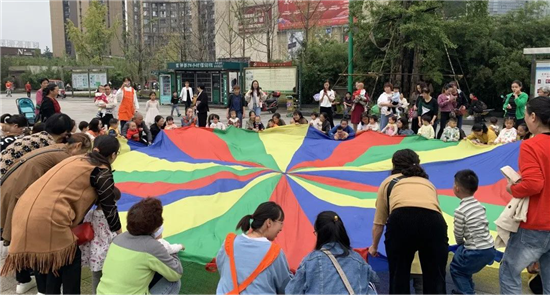 派对为家长和孩子们提供了丰富有趣的亲子互动游戏,各类集体游戏促进了幼儿与同伴交往沟通的能力。现场彩虹伞小游戏很受家长和孩子们的喜爱。妈妈们抱着宝贝们“踩尾巴”,爸爸们则在旁边摇旗呐喊。赛况非常激烈,整个广场回荡着欢声笑语、加油助威的声音。