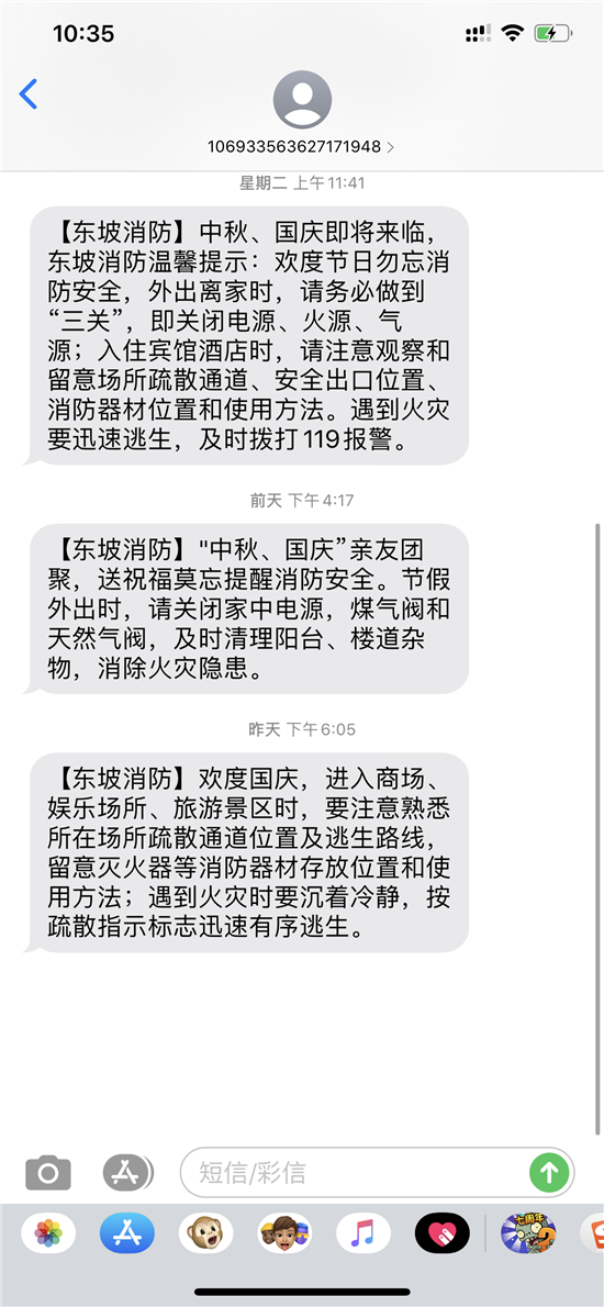 四川新闻网消息“东坡区消防救援大队温馨提示:欢度国庆,进入商城、娱乐场所、旅游景区时,要注意熟悉所在场所的疏散通道位置和逃生路线,留意灭火器等消防器材存放位置和使用方法;遇到火灾时要沉着冷静,按疏散指示标志迅速有序逃生。”为提醒广大市民关注消防安全,减少不必要的火灾损失,东坡大队在节日期间借助移动、联通等通讯平台,每天向全市广大市民发送万余条温馨提示短信,助推节日消防安全保卫工作。