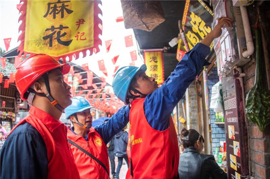 有山有水的柳江古镇是四川十大古镇之一。为确保“双节”期间古镇用电安全稳定,国网洪雅供电公司柳江供电所早早进入备战状态,在“双节”前就针对柳江古镇重点景点集中、用电负荷集中的特点,量身定制了详细的供电服务方案,组织保电人员对景区内的配电箱、开关、保险等设备进行排查;供电所的共产党员志愿者延伸供电服务,为古镇上的商家开展义务排查、发放安全用电资料,指导商铺安全用电,为迎接八方宾客提前做好准备。