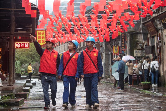 节日期间,古镇绵绵的细雨丝毫没有影响游客的兴致,却让游客真正欣赏到了独一无二的“烟雨柳江”画意。然而连续的阴雨天气与不断增多的游客,使安全用电风险相应增加,保电服务队的安全责任与压力也成倍增加。为此,柳江供电所保电人员增加巡视次数,定时进行电压测试,及时发现消除设备隐患,同时严格24小时值班制度,应急抢修随时待命,保障供电设备安全稳定运行。10月5日下午13时10分,古镇里最大的一家客栈李家大院因漏电引起总漏保停电,正在游人如织的古镇上巡视的保电人员张典静、白伟、徐伟三人接到消息后,快速奔跑至故障配变点,及时处理故障恢复供电。