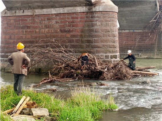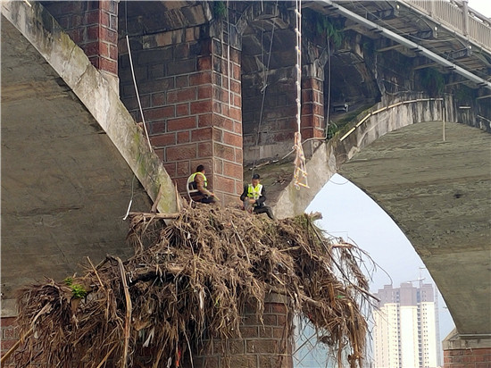 当天,已明确由专人组织、督导、检查,根据实际情况分别采取不同的清理、打捞方式,全面展开垃圾清理。抽调10余名工作人员,桥面放置告示牌,拉上警戒线,清理工作人员从桥面沿吊绳进入桥墩,身系安全绳,身着救生衣,手持电锯,有条不紊地清理着桥墩上的堆积物。争取在最短的时间内,确保清理工作顺利完成,全面清除桥墩上的漂浮垃圾。达到河面无杂物、河中无障碍、河岸无垃圾的目标。