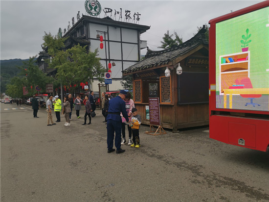 宣传车一驶入古镇,便吸引了大量游客驻足围观。宣教员利用消防宣传车数字化、系统化、标准化的特点,通过电子显示屏和LED图文显示系统声图并茂地播放消防安全公益广告、经典火灾案例、119火灾警示教育影片,让景区游客和商家住户对火灾的防控有更深刻直观的印象,并用通俗易懂的语言为大家讲解家庭常见火灾隐患查找和整改方法、以及火灾发生时的报警方法、灭火器的使用、火场逃生方法等知识。