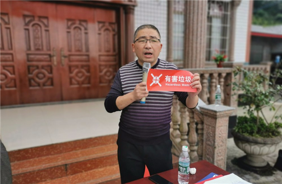 手举着标志标识牌,县农业农村局相关负责人对垃圾分类的重要性、如何进行垃圾分类、垃圾桶的投放等进行讲解,并发放宣传画册。让参会人员了解分类、学会分类、主动分类,有了直观地了解,也有利于进一步做好垃圾分类宣传工作。