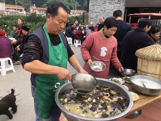 中午11点半,庆祝环节后,村民们开始摆桌、挪椅子、上菜,不用多说,大家以无言的默契很快就将宴席摆好,老人们也乐呵呵地入座开始享受美食。“你牙齿不好,这个菜耙,多吃点。”“今天开心,菜都要多吃几口。”……