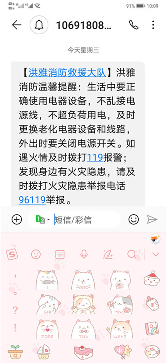 “洪雅消防温馨提醒:生活中要正确使用电器设备,不乱接电源线,不超负荷用电,及时更换老化电器设备和线路,外出时要关闭电源开关。如遇火情及时拨打119报警;发现身边有火灾隐患,请及时拨打火灾隐患举报电话96119举报。”洪雅大队充分利用短信平台这一载体覆盖面广、言简易记的特点,让一条条温馨提示的短信走进千家万户,使消防安全意识扎根于每位群众的脑海。