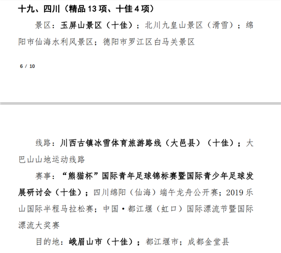 2020中国体育旅游十佳精品项目(以下简称“十佳项目”),全国一共评定了38项,四川有4项,分别是洪雅县玉屏山景区、川西古镇冰雪体育旅游路线(大邑县)、“熊猫杯”国际青年足球锦标赛暨国际青少年足球发展研讨会、峨眉山市。