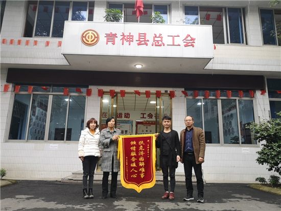 四川新闻网消息(涂建平 文/图)“扶危济困解难事 倾情服务暖人心”。12月1日,职工张建勇风尘仆仆赶到青神县总工会,将一面大大的锦旗送到了常务副主席陈建英手中,激动地说:“没有工会,就没有我的今天。在我最困难的时候,是工会伸出了援助之手,一帮就是2年,让我抗过了寒冬酷暑、疫情和洪水,解决了子女读学难等等问题,真的非常非常感动……一面锦旗,仅表心意!”