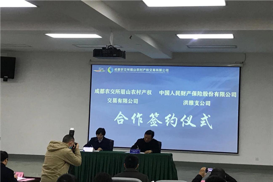 揭牌仪式后,成都农交所眉山农村产权交易有限公司与中国农业银行股份有限公司洪雅县支行、中国人民财产保险股份有限公司洪雅支公司进行了现场签约。