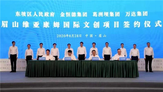 8月28日,东坡区人民政府与葛洲坝集团、万达集团和金恒德集团签署项目投资协议,标志着全球三大传媒集团之一的美国维亚康姆国际文创项目正式落户眉山。这是维亚康姆集团在中国的第一个大型文创项目。项目建成后,将引入“世界音乐大会暨MTV亚洲音乐盛典”,每年举办文化音乐演出类活动10场以上,吸引游客量预计约300——1200万人次,制作儿童频道内容5集以上,创作创新型品牌IP3个以上。据统计,全年共引进维亚康姆国际文创城、天府小猪佩奇小镇、幸福古村齐乐桃源国际旅游度假区等重大文旅项目6个,投资总额达636亿元。