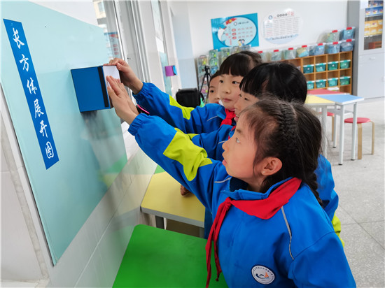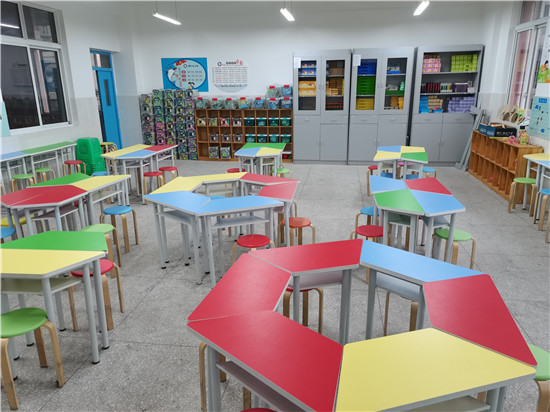 据悉,该数学实验室八十多平方米,能容纳六十多位学生的实验教学课。实验室里,摆放了学校专门购置的不同颜色的梯形课桌,可自由拼成正六边形、大梯形、平行四边形、箭头形等。实验室的内外墙布置是该校《培养小学生基本活动经验的图形与几何实验教学研究》课题组的老师自行设计制作的,涵盖了小学一年级到六年级的几何图形知识,可供学生观察、操作并自由"玩"。如图形运动,采用平分脸谱,组成华容道去平移;图形位置整合了小学各学段相关内容,再摆上可活动的小磁块,让学生边玩边说,在自叙情景中去摆弄并理解数学。