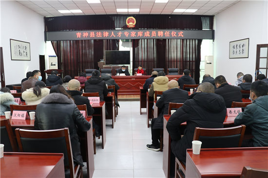 四川新闻网消息(罗瑞秋 文/图)1月12日下午,青神县法学会在县人民检察院四楼会议室举行法律人才专家库成员聘任仪式,县委政法委常务副书记宋志全出席会议并为20名法律人才专家库成员颁发了聘书,县级有关部门分管领导及各乡镇(街道)政法委员参加,张志华等3名成员代表作了表态性发言。