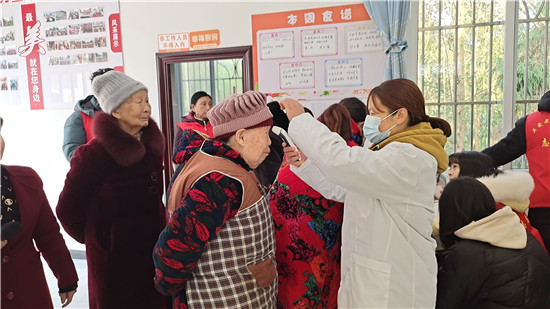 花溪社区日间照料中心志愿者为参加活动老人测体温(张燕 摄)