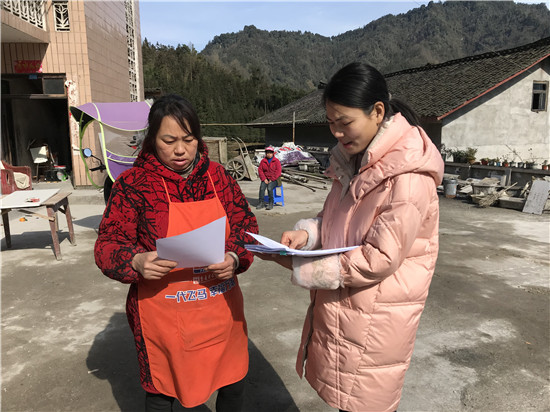 1月21日,高庙镇纪委书记邓曲(右一)在水秀村为群众发放换届选举宣传资料