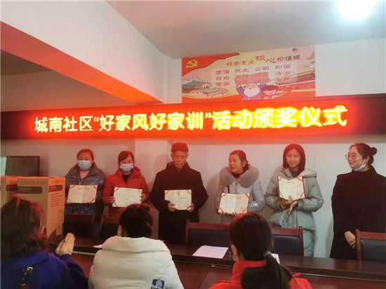 据悉,在1月中旬时,城南社区安排网格员广泛向社区居民宣传,积极向城南社区邮箱投稿,分享自身的家风、家训故事。经过社区书记的一遍遍反复筛选,选出了6家具有代表的家庭。其中一等奖为翡翠城一居民,她30出头,家中母亲瘫痪多年,自己尽心尽力地照顾,从未有过抱怨,对家中小孩也是言传身教,告诉小孩子要孝顺父母……。