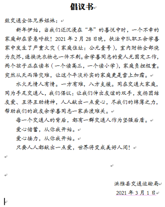 四川新闻网消息(付孟君 记者 李田)3月1日,洪雅县交通运输局发出倡议,为该局执法中队职工余学喜进行爱心捐款活动。