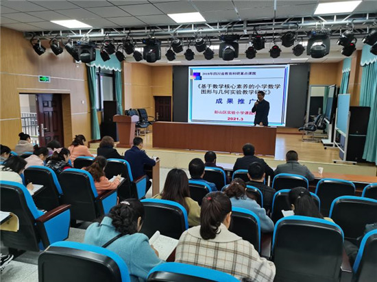 会上,彭山区实验小学省级重点课题《基于数学核心素养的小学数学图形与几何实验教学研究 》课题组盛光林老师作了成果分享报告。