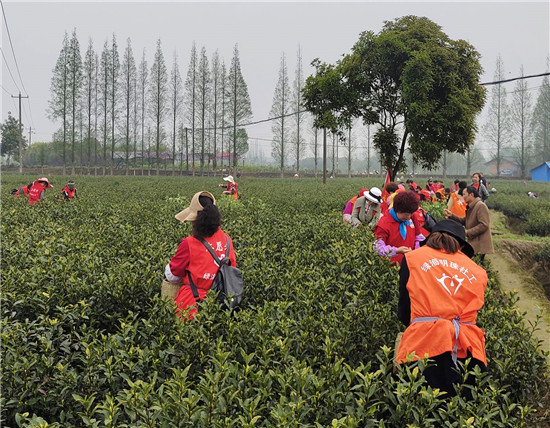 在该县将军镇杨场村的茶园里,组队前来的社工手提竹篮,头戴草帽,在茶园里娴熟地采摘着鲜叶,现场很是热闹。