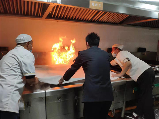 培训分为两个环节,第一环节是消防安全理论知识培训。大队培训教官从厨房火灾的危害性、紧急应对措施、隐患自查以及消防产品的正确使用方法、逃生自救以及用电、用气、用油等方面进行了详细的培训讲解,让每位食堂员工深刻感受到火灾的无情及掌握消防知识技能的重要性。第二环节是理论联系实际,强化隐患排查与灭火处置。大队培训教官在工作人员的带领下来到厨房,通过现场引导大家发现火灾隐患,排除火灾隐患,正确使用灭火毯进行灭火,示范消火栓、灭火器使用,讲解注意事项等来强化食堂员工消防安全理论思想,增强灭火技能。