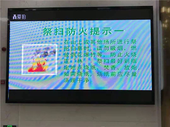 通过播放消防宣传公益广告,不仅向单位员工、过往人群宣传消防知识,实现消防宣传全天候、多角度、大纵深的整体推进,更是形成了有力的消防宣传辐射网络,扩大了消防宣传覆盖面,为全面做好清明期间消防安全工作打下坚实的基础。