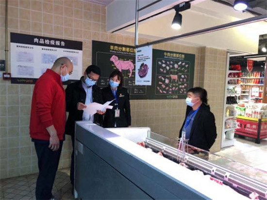 本次检查以“家家乐”“邻你”超市为重点检查对象,以牲畜鲜肉为重点品种,对超市经营肉品的“两证两花一报告” 进行了详细检查,要求经营主体要把控进货渠道,留存商家资质、检疫票据等材料,保证产品的全程可追溯性。