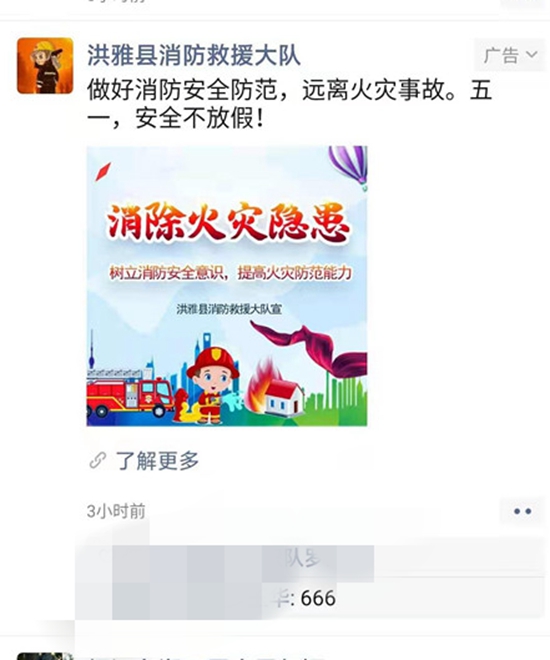 四川新闻网消息(余欢 文/图)为真正实现“普及全民消防安全知识,提高全民消防安全意识”这一目的。4月30日,洪雅大队结合“五一”契机,创新思维,打破传统消防宣传模式,与电信公司合作,利用大数据平台,面向微信朋友圈推送消防安全提醒公益广告。