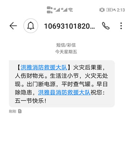 “【洪雅县消防救援大队】火灾后果重,人伤财物光。生活注小节,火灾无处现。出门断电源,平时查气罐。早日除隐患,洪雅县消防救援大队祝您:五一节快乐!”全县广大手机用户将陆续接收到了洪雅县消防救援大队的温馨提示短信,使广大群众零距离了解消防,增强消防安全知识。