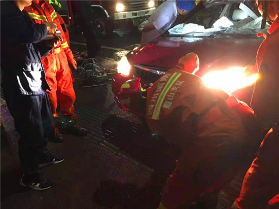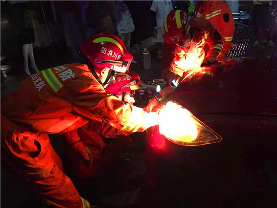 消防指战员对现场情况进行了解后,随后对现场实施警戒,消防指战员用绝缘剪将汽车的线路剪断防止漏电 ,随后用液压破拆组对车辆进行破拆,解救车上伤员;经过十分钟左右的努力,伤员被成功解救。