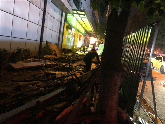 执法人员现场警戒、清退闲杂人员、有序疏导交通,专业施工人员现场拆除,经过12个小时连续施工,13座占道售货亭被连夜拆除,清理占道面积52平方米、垃圾5车。
