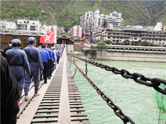 党员干部们重走泸定桥,现场体验和感悟当年红军在铁索链上的勇气和决心。