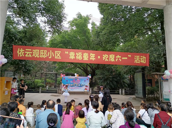 依云观邸小区党支部组织13个楼栋小朋友自编自排23个唱歌、舞蹈、朗诵、弹琴等活动,活动现场其乐融融。
