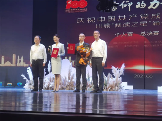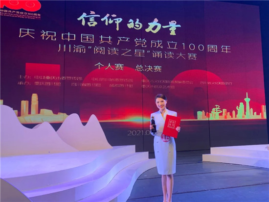 四川新闻网消息 红星向党,声动川渝。6月6日晚,“信仰的力量—庆祝中国共产党成立100周年川渝‘阅读之星’诵读大赛”个人赛总决赛在重庆群星剧院举行。来自川渝两地的二十强选手共聚一堂,以文献为媒介、以声音为纽带,读百年党史、诵盛世华章。经过激烈角逐,由眉山市图书馆选送的赵忆,摘得“阅读之星”最高荣誉——“星光金奖”。