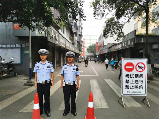 “车辆不能进入,要停放在指定区域。”考场外,记者看到共设置有三个交通管制点,交警提前做好引导疏通,电力、消防等工作人员也提前就位,为高考护航。