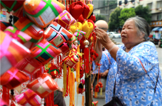 四川新闻网消息(郭侨 潘建勇 记者 李田)6月11日,在仁寿县城区街头的一处树荫下,一个挂着各式各样的端午节香包的摊位吸引了来往群众。80岁的蒋贵容一边售卖自制手工香包,一边有条不紊地继续制作新的香包。